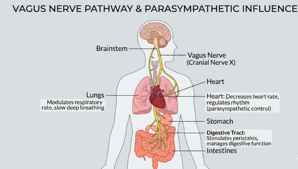 The vagus nerve is the superhighway of your nervous system. It connects your brain to your heart, lungs, and gut, acting as the primary brake for your stress response. “Vagal toning” refers to exercises that stimulate this nerve to tell your brain that you are safe.